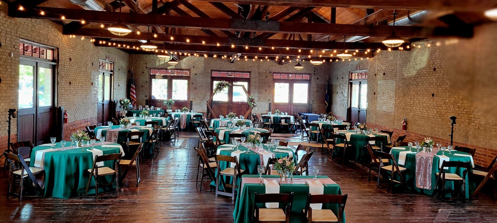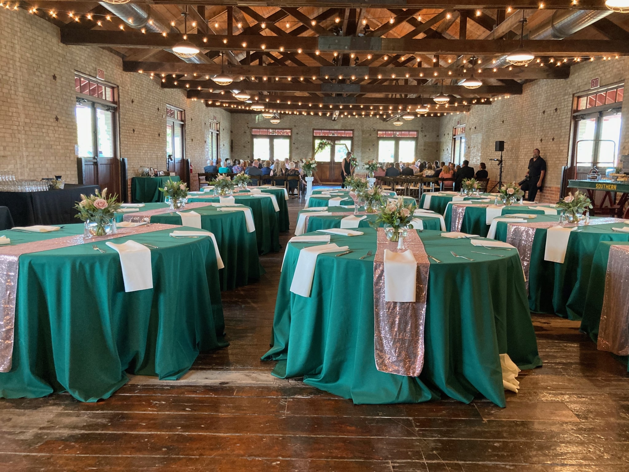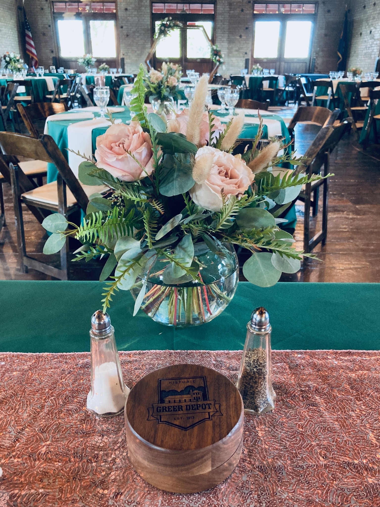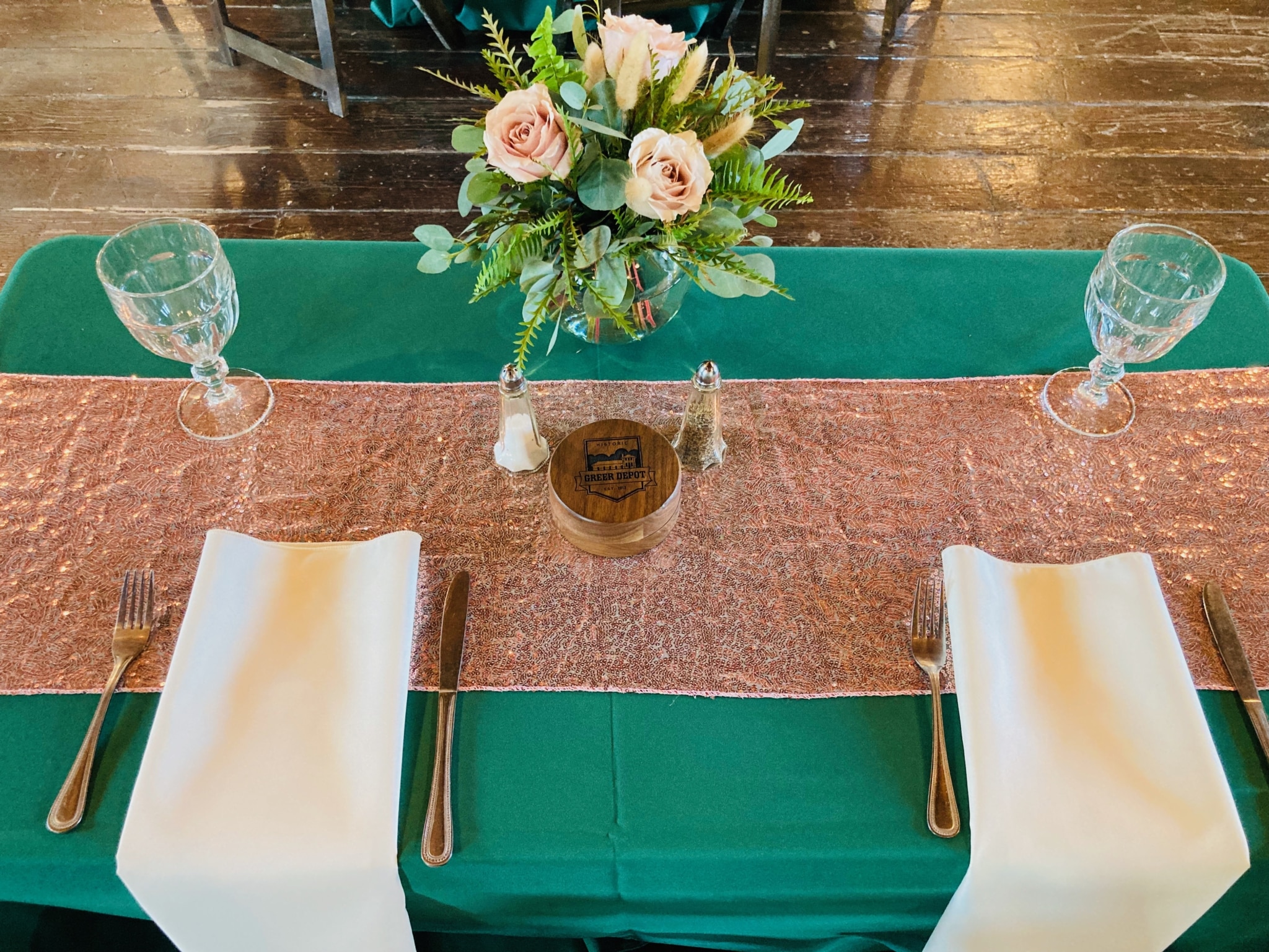 An elegant wedding decorated with rose gold and deep green! Greer Event Rentals provided the tables, chairs and linens. Holmes Catering provided a delicious meal in beautiful copper chafers. Holly’s Cakes provided individual desserts for the guests. Bartending services were provided by Bearded Bartenders. Forevermore Farm Florals provided the beautiful centerpieces and wedding arch arrangements. My Wedding Director & Officiant executed the coordination and day of directing. DJ services were provided by Audio Grafs. Meant to Be Studios handmade the beautiful dark walnut jewelry box to be given as a gift for the bride & groom. The couple had a beautiful day thanks to a great team of vendors and staff!