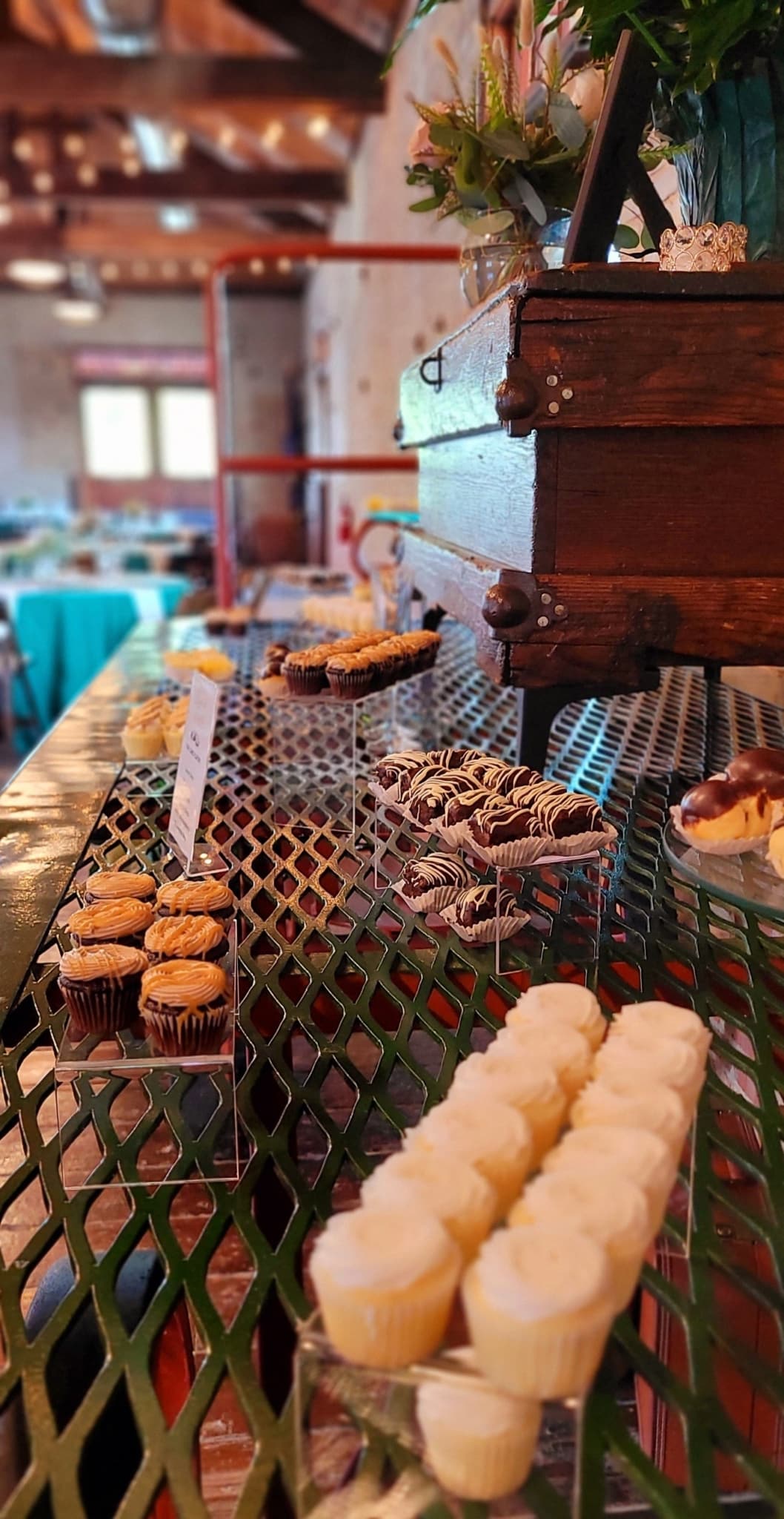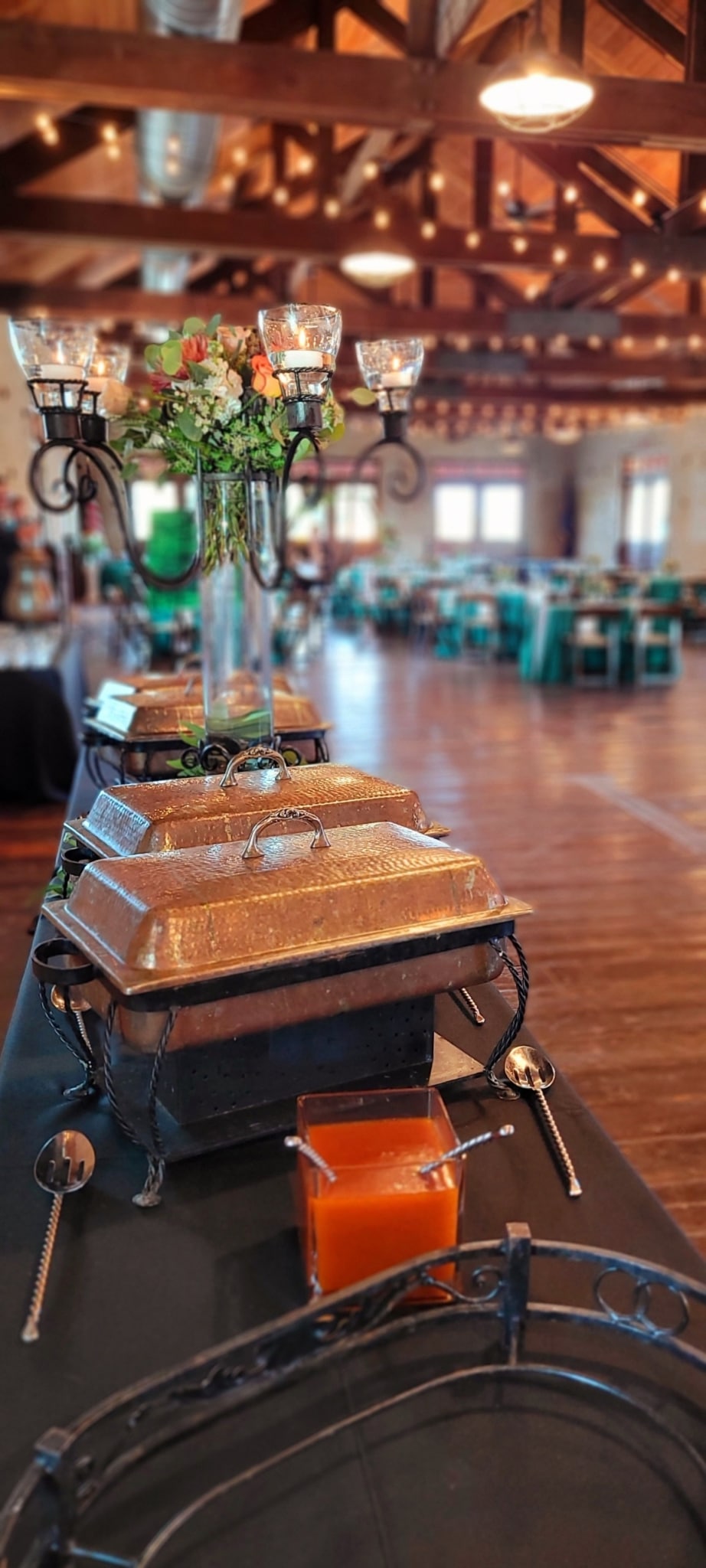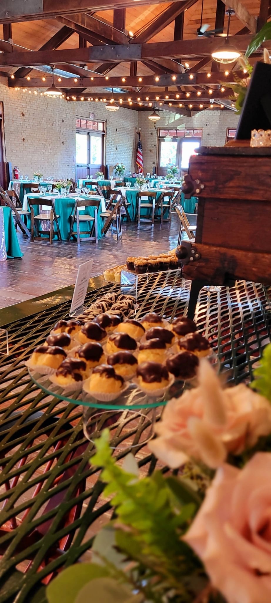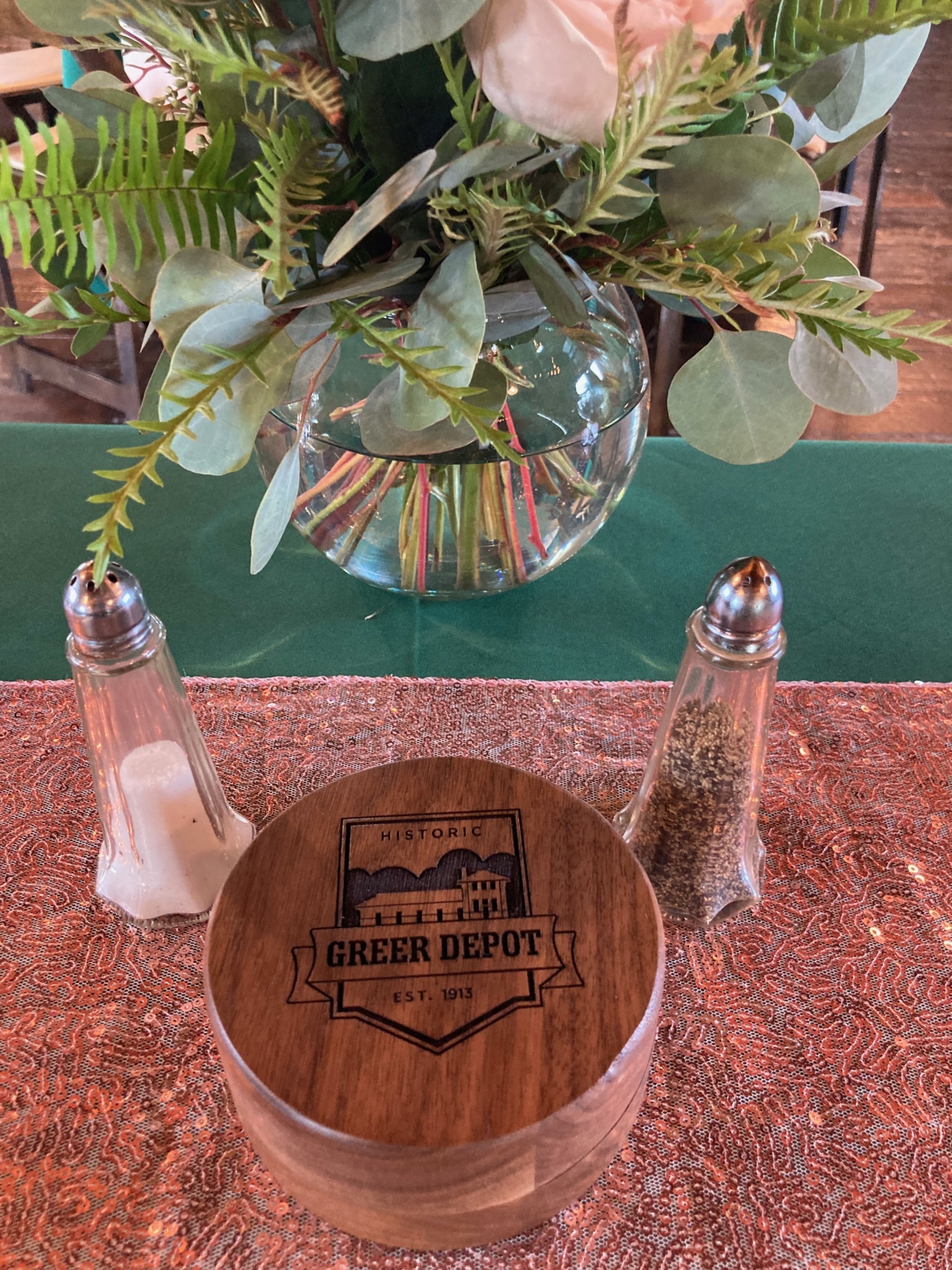 An elegant wedding decorated with rose gold and deep green! Greer Event Rentals provided the tables, chairs and linens. Holmes Catering provided a delicious meal in beautiful copper chafers. Holly’s Cakes provided individual desserts for the guests. Bartending services were provided by Bearded Bartenders. Forevermore Farm Florals provided the beautiful centerpieces and wedding arch arrangements. My Wedding Director & Officiant executed the coordination and day of directing. DJ services were provided by Audio Grafs. Meant to Be Studios handmade the beautiful dark walnut jewelry box to be given as a gift for the bride & groom. The couple had a beautiful day thanks to a great team of vendors and staff!
